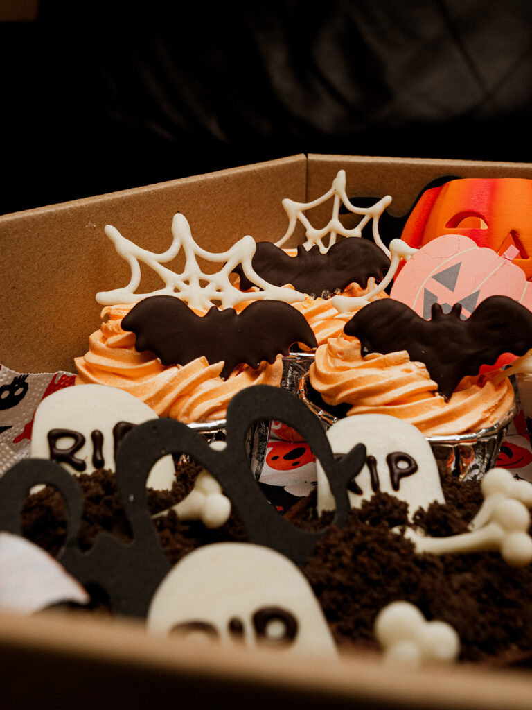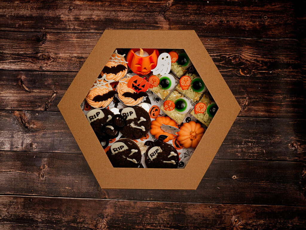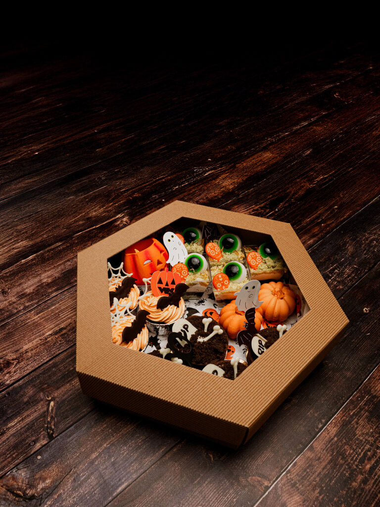 Przerażająco pyszny, nieprzyzwoicie efektowny i idealny na halloweenowe przyjęcie. Box Halloween w wersji słodkiej to zestaw deserów, które wyglądają jak z upiornej cukierni – mroczne, kolorowe i pełne zaskoczeń. Każdy kęs to połączenie zabawy i kulinarnej magii, która przywołuje dreszcz emocji.